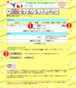 水着の注文数を変更したい場合は@の数量を変更し「 更新ボタン 」を押して下さい。